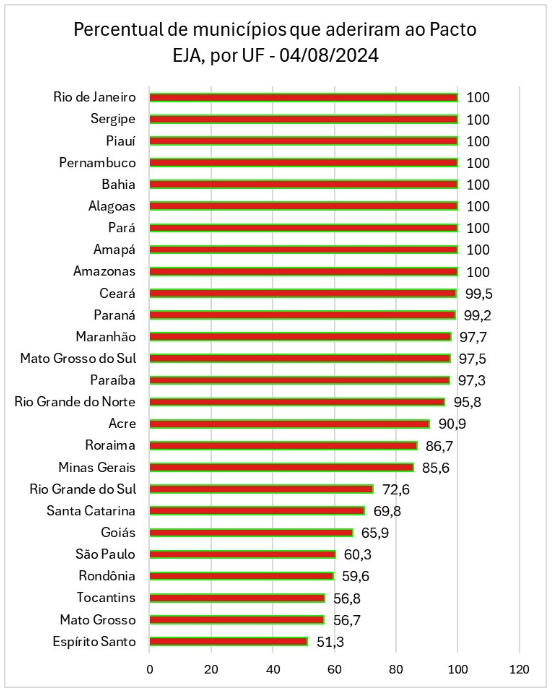Somente 16% das redes municipais de ensino não aderiram ao Pacto Nacional pela Superação do Analfabetismo e Qualificação da Educação de Jovens e Adultos (Pacto EJA) . A iniciativa busca superar o analfabetismo e elevar a escolaridade de jovens e adultos no País . Os estados com menor participação entre os seus municípios são Espírito Santo (51,3%), Mato Grosso ( 56,7%) , Tocantins ( 56,8%), Rondônia (59,6%) e São Paulo (60,3%).