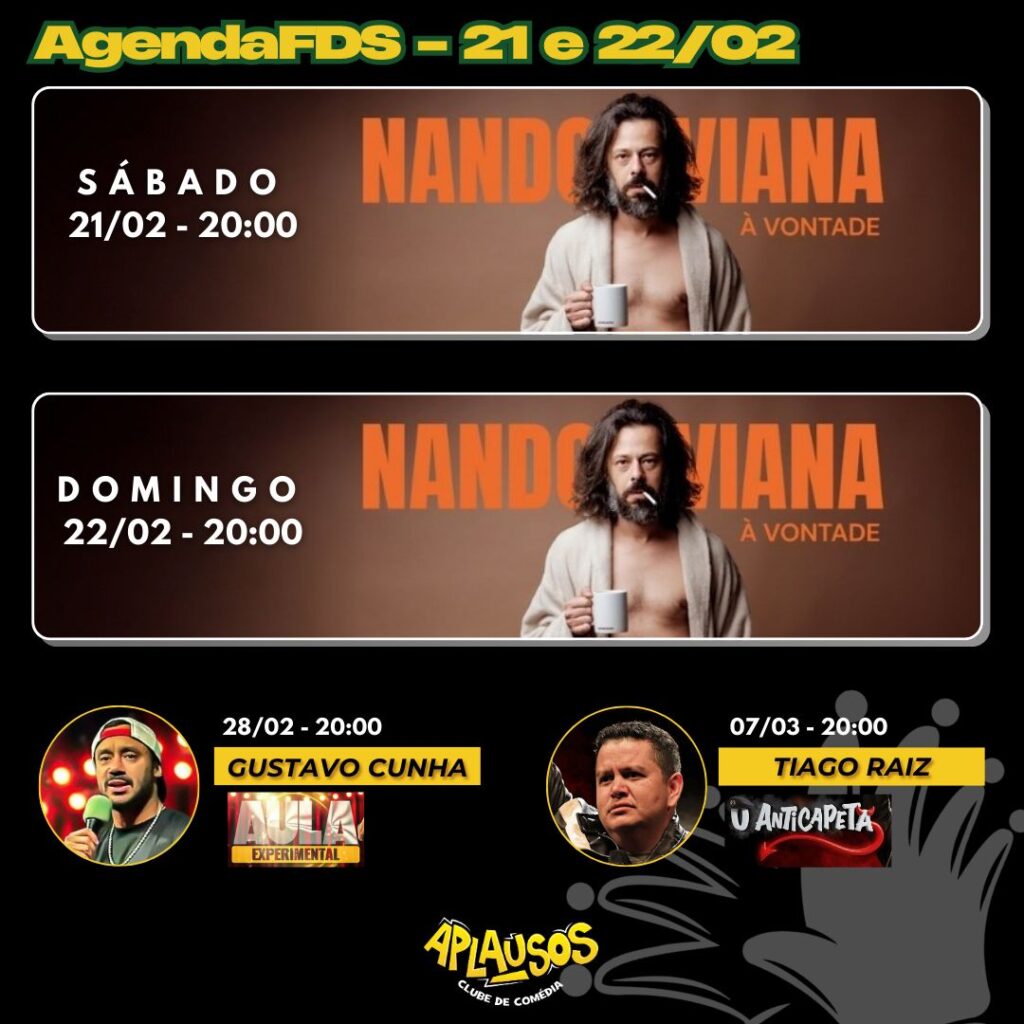 Nando Viana, conhecido por participações em programas como “A Culpa é do Cabral” e por sua carreira consolidada no stand-up desde 2008, é reconhecido pelo humor observacional sobre o cotidiano, TDAH e ansiedade, atraindo plateias de todas as idades. Sua trajetória inclui apresentações em grandes casas de comédia pelo Brasil e presença em plataformas como YouTube e Instagram, onde acumula milhões de seguidores.