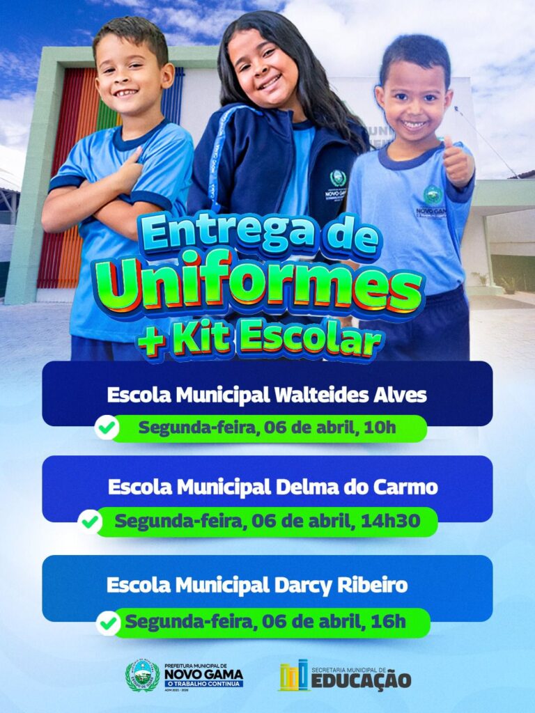 A Prefeitura de Novo Gama, no Estado de Goiás, convida toda a comunidade escolar para a entrega de uniformes e kits escolares nas Escolas Municipais Walteides Alves, Delma do Carmo e Darcy Ribeiro. A ação será realizada na próxima segunda‑feira, 6 de abril, com horários diferenciados em cada unidade, visando ordenar a participação de estudantes, pais, responsáveis e servidores da rede municipal de ensino. A iniciativa integra o calendário de apoio ao início do ano letivo e reforça o compromisso da gestão com a permanência e a qualidade da educação no município.
