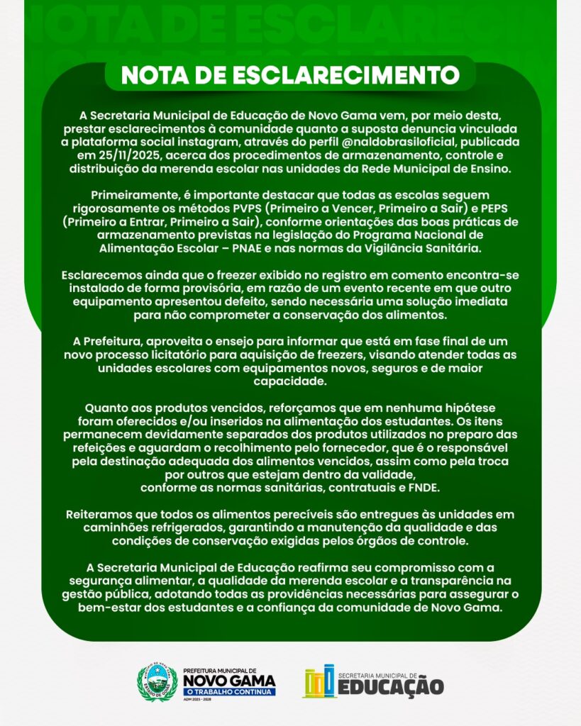 A Secretaria Municipal de Educação de Novo Gama divulgou nota de esclarecimento à comunidade acerca de questionamentos relacionados aos procedimentos de armazenamento, controle e distribuição da merenda escolar nas unidades da Rede Municipal de Ensino. A manifestação tem como objetivo assegurar transparência à população e reafirmar o rigor adotado no cumprimento das normas sanitárias e legais que regem a alimentação escolar.