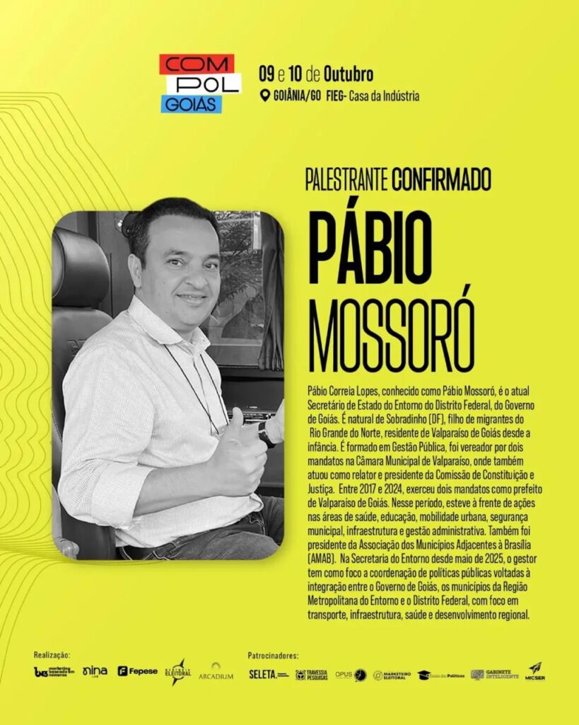 Nos dias 9 e 10 de outubro, Goiânia sedia o COMPOL Goiás, o maior evento de comunicação política e institucional do Brasil. A programação inclui um painel no dia 9, às 10h45, com a participação do secretário de Estado do Entorno do Distrito Federal, Pábio Mossoró; do secretário do Entorno do Distrito Federal (Seent-DF), Cristian Viana; e da secretária de Economia, Gestão e Planejamento de Pirenópolis, Escolástica Menezes.