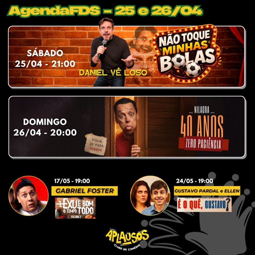 A agenda do Aplausos prossegue vibrante, com “Humor no Ponto G” na sexta (24/04), estrelado pelo próprio Vê Loso ao lado de Leo Ladislau e a sexóloga Adriana Araújo, e Nil Agra no domingo (26/04). Esses eventos reforçam Brasília como polo de comédia de qualidade, convidando o público a celebrar o talento local.